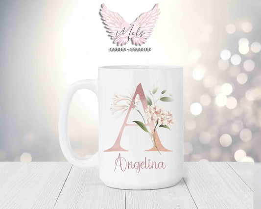 Personalisierte Keramik-Tasse in Weiß-Matt mit Blumen-Alphabet & Namen