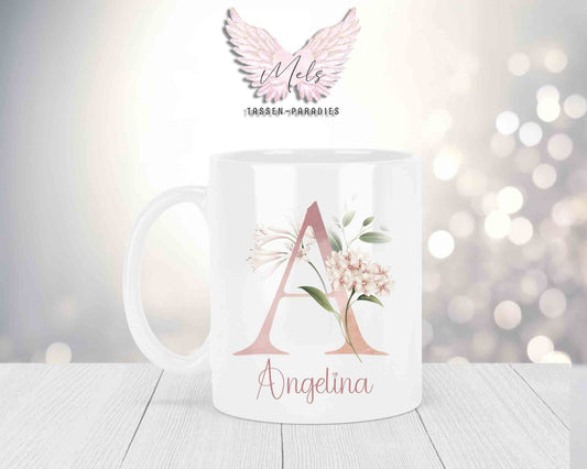 Personalisierte Keramik-Tasse in Weiß-mit Blumen-Alphabet & Namen