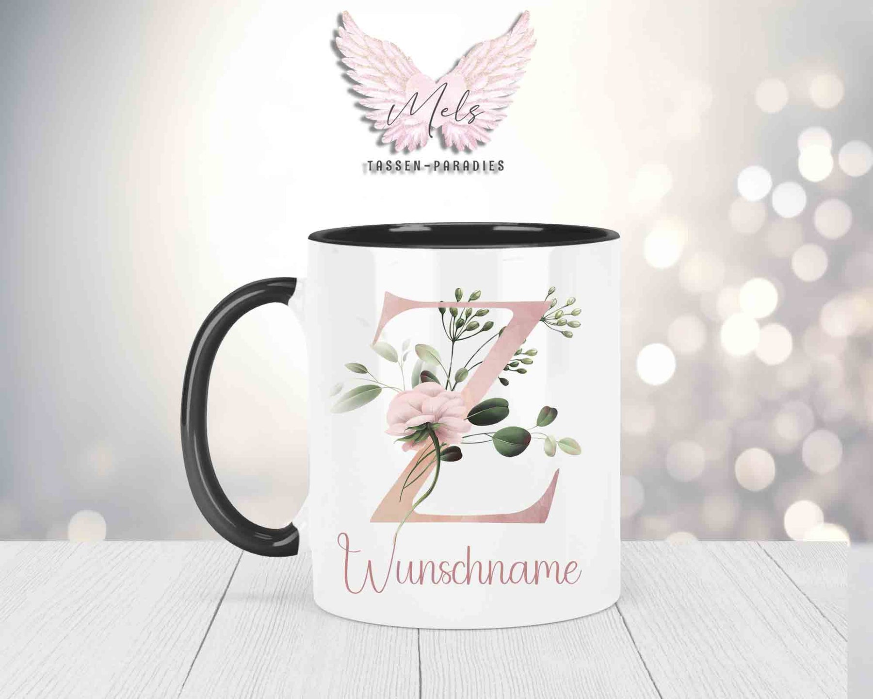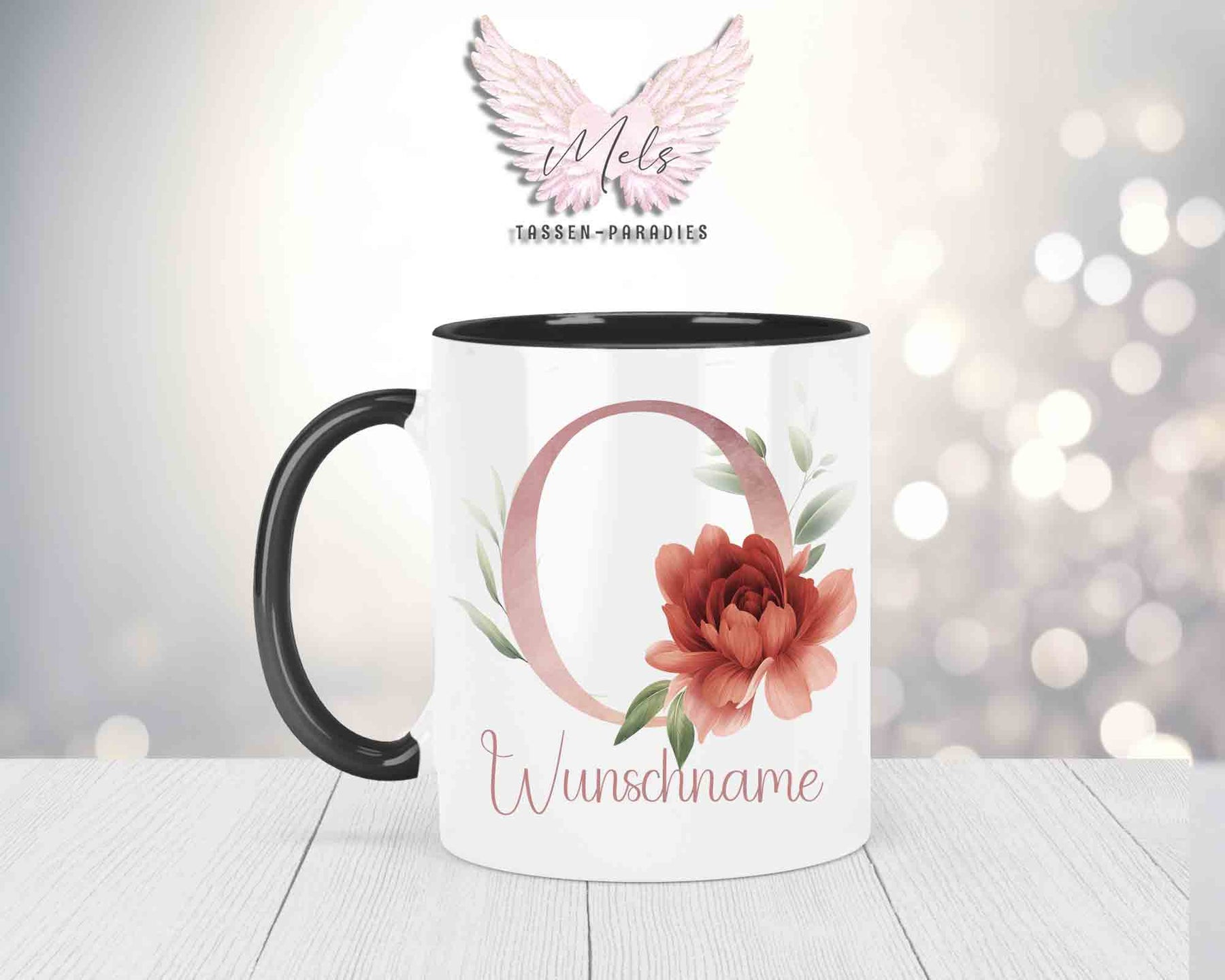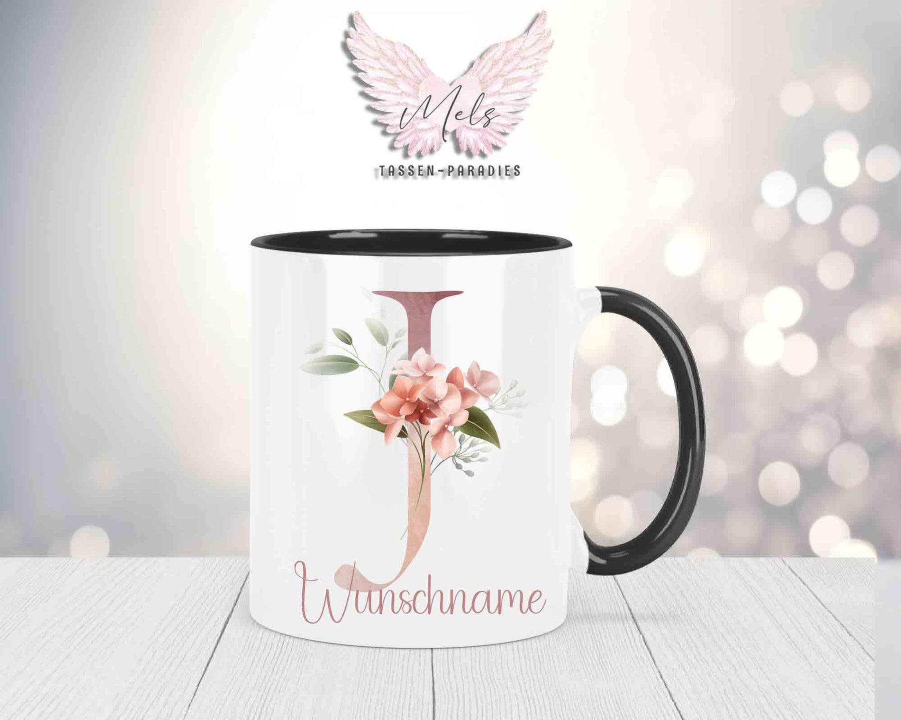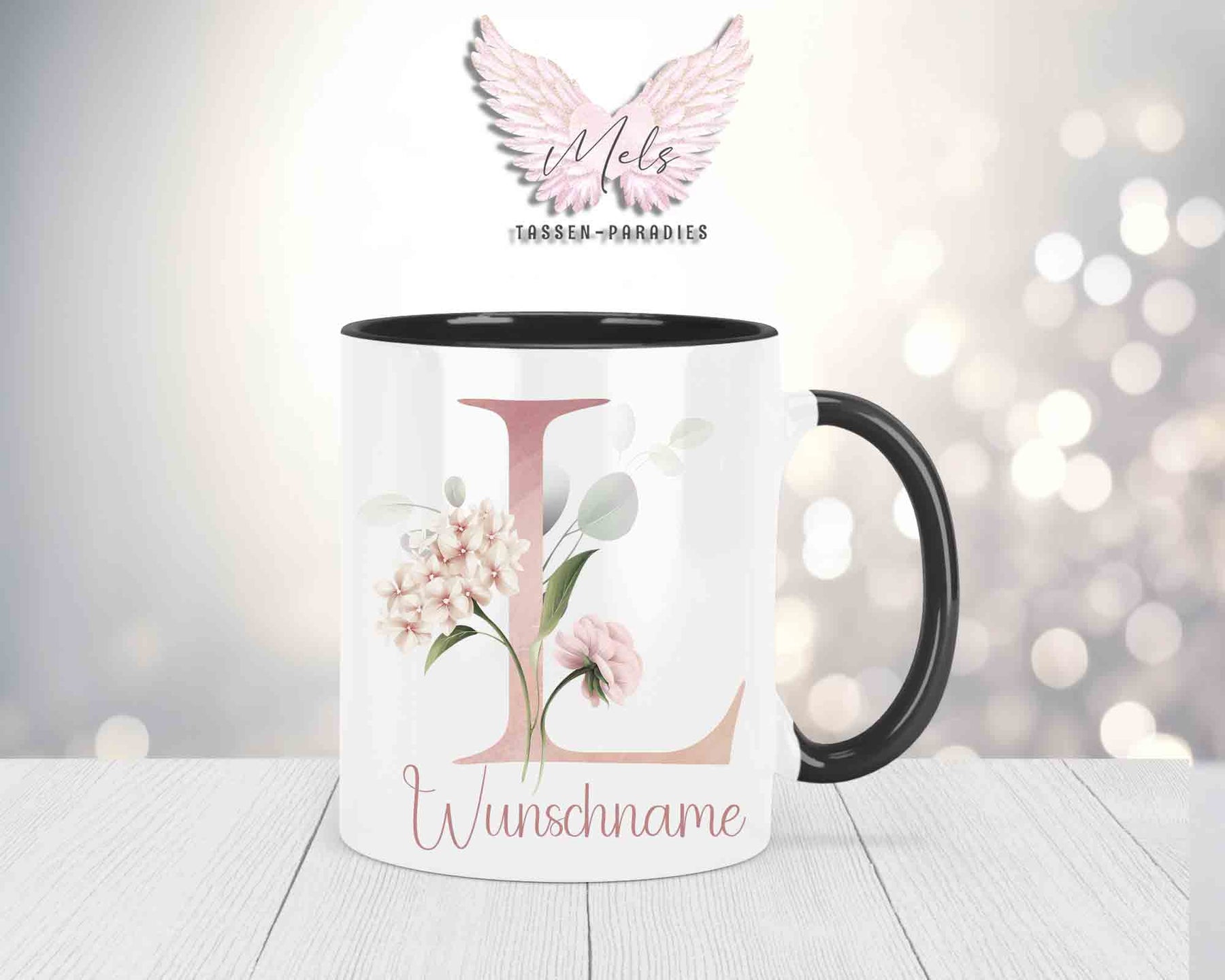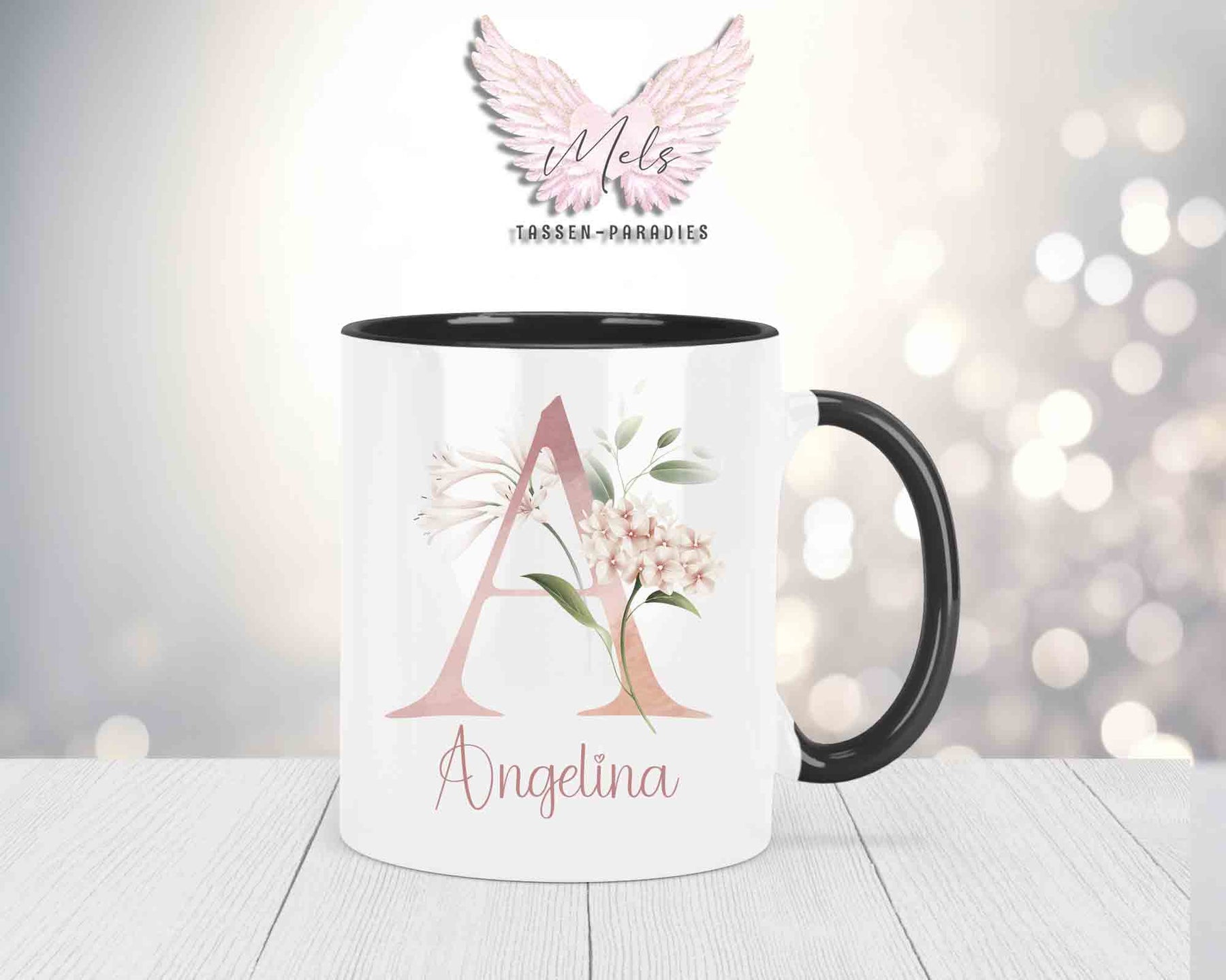 Blumen-Alphabet mit Name - Personalisierte Keramik-Tasse Schwarz