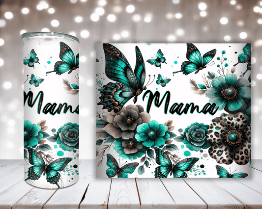 Thermobecher Mama mit grünen Blumen und Schmetterlingen