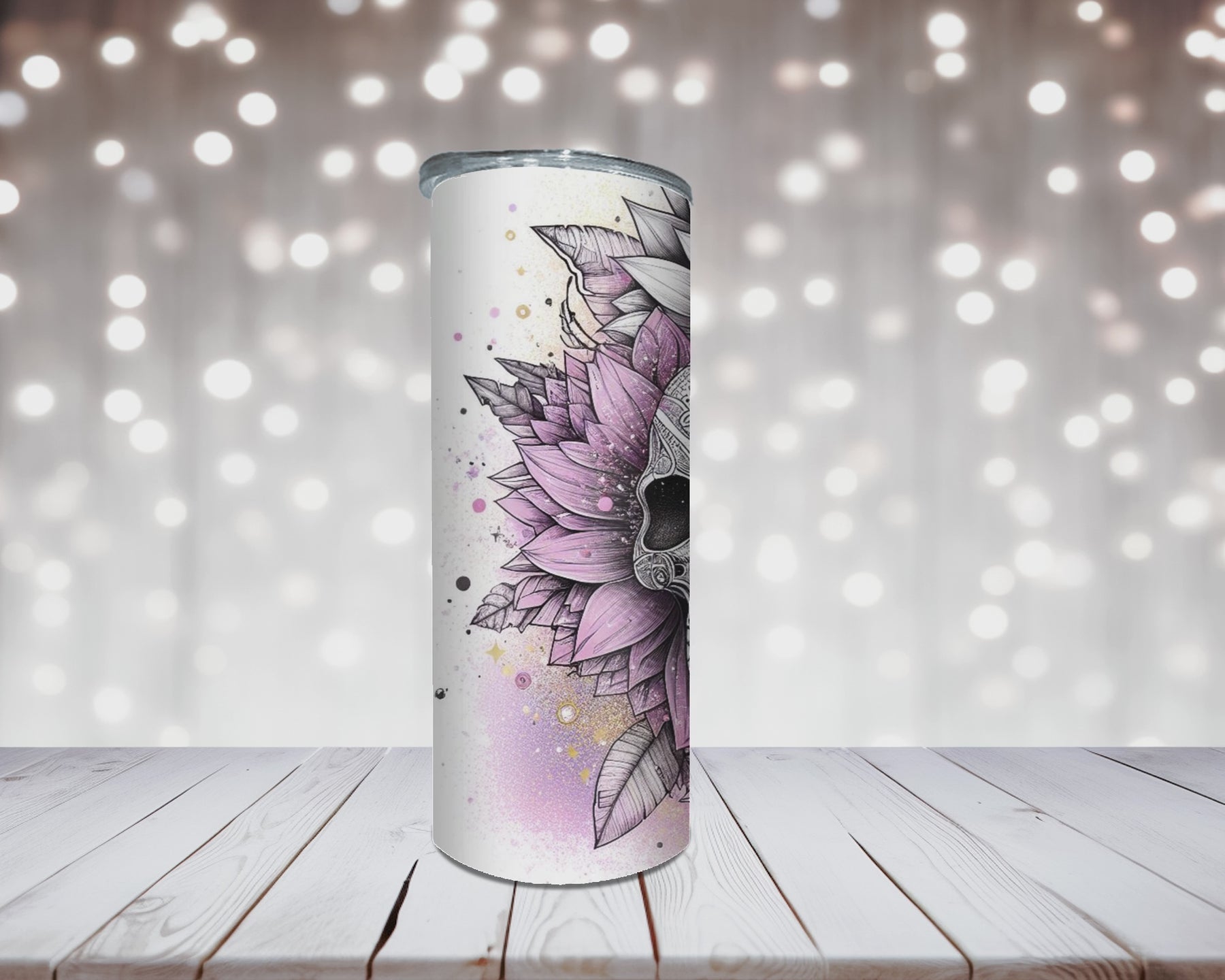 Der Thermobecher „Skull mit Sonnenblumen“ kombiniert einen markanten Totenkopf mit leuchtenden Sonnenblumen und sorgt so für eine besondere Mischung aus Stil und Individualität.