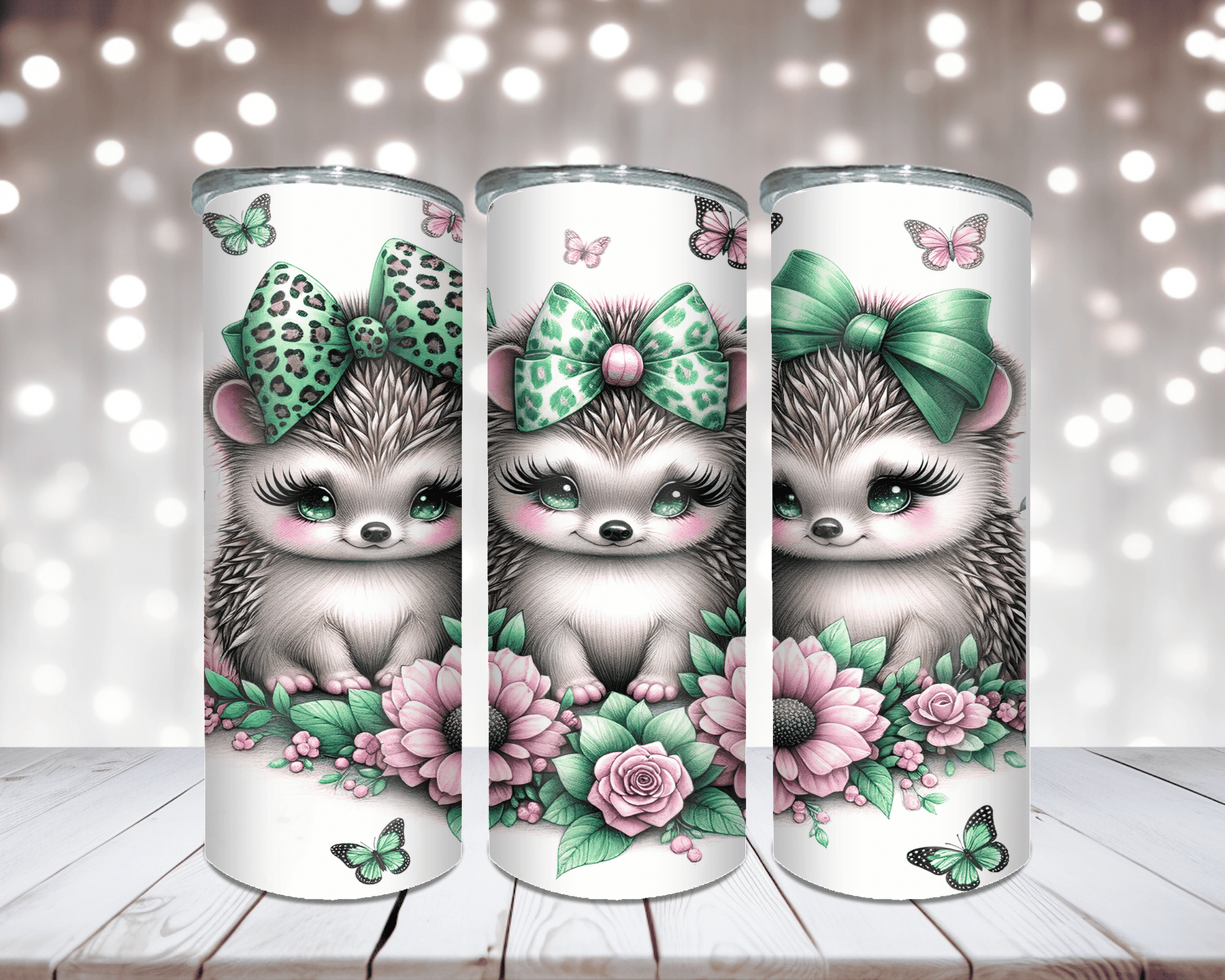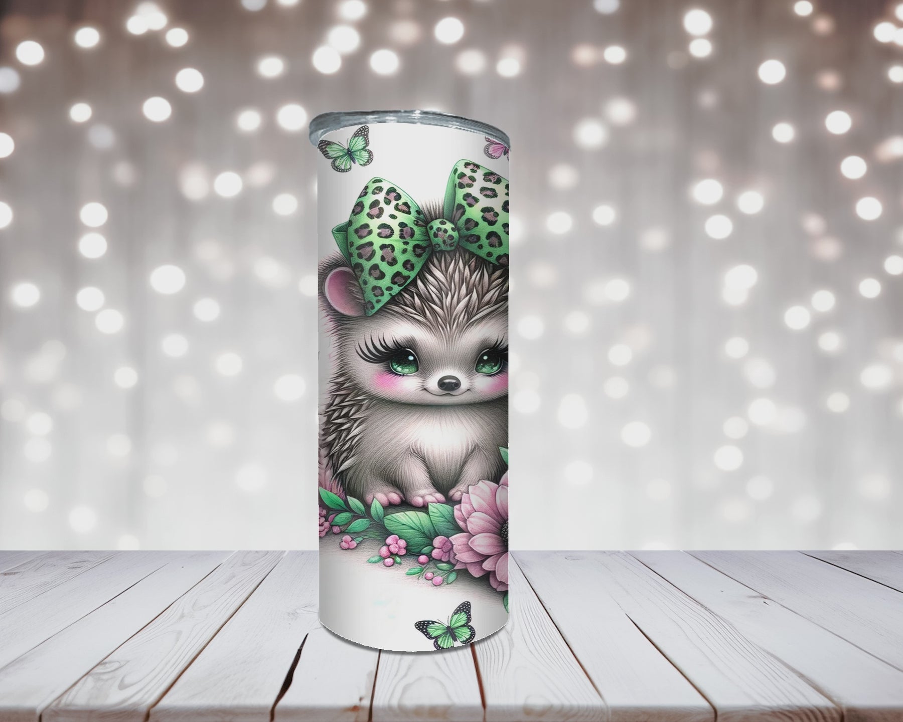 Der Thermobecher „Süße Igel mit grüner Schleife“ vereint Funktionalität und niedliches Design.