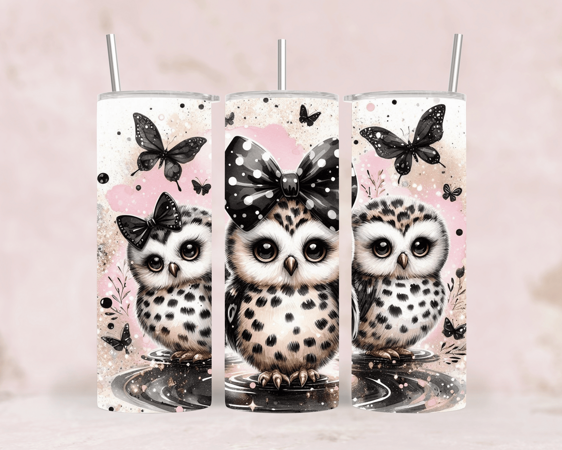 Das liebevolle Design zeigt drei niedliche Eulen mit Schleifen, umgeben von einem zarten Schmetterling ein perfekter Begleiter für alle, die originelle und detailreiche Motive lieben.