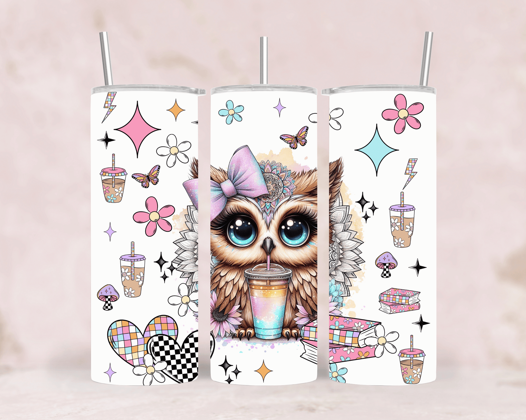 Tauche ein in eine Welt voller Magie mit unserem Thermobecher „Eule mit Sternen, Blumen & Büchern“