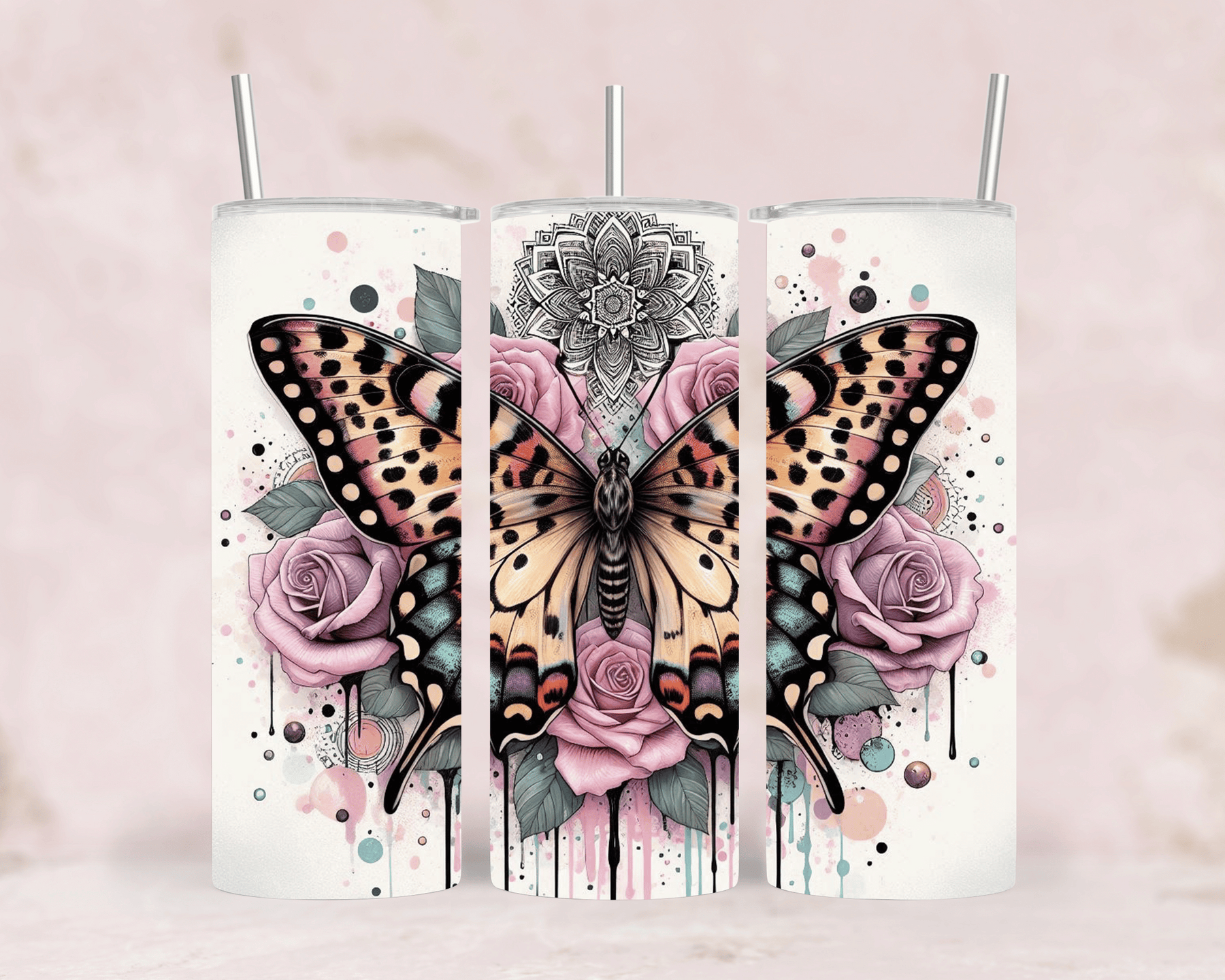 Hol dir romantische Leichtigkeit mit unserem Thermobecher „Schmetterling & Rosa Rosen“.