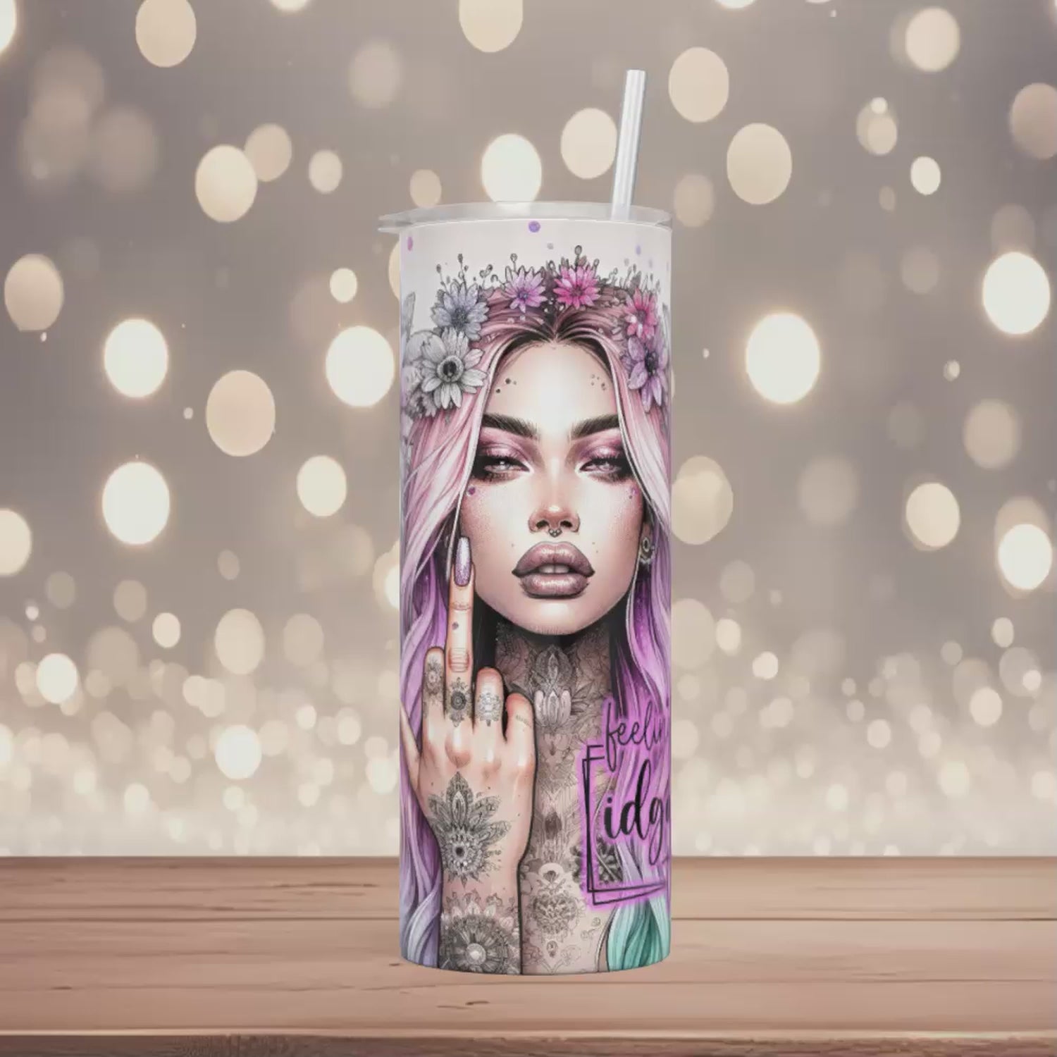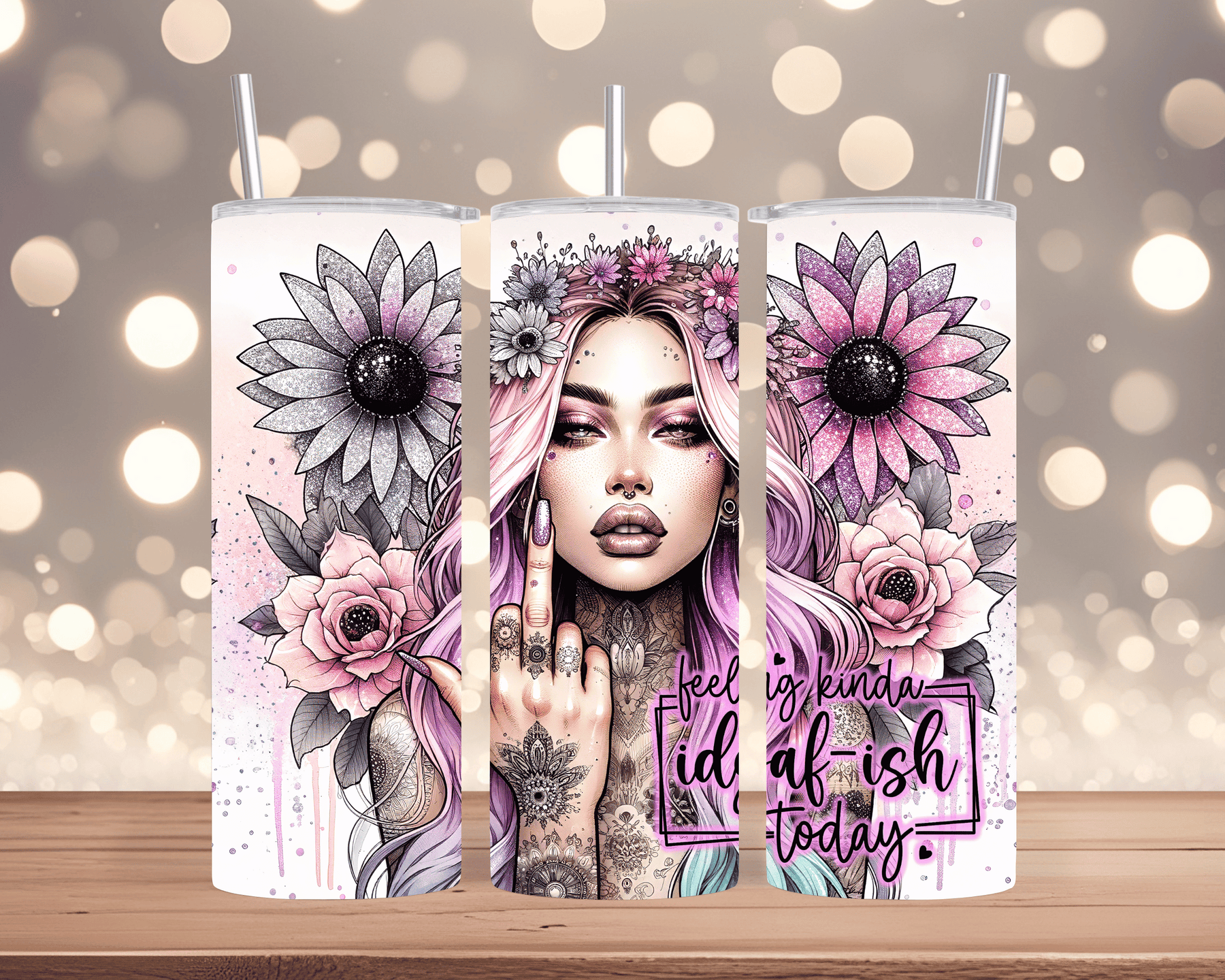 Das auffällige Design zeigt eine freche Frau, die den Mittelfinger hebt, kombiniert mit dem lässigen Spruch „Feeling Kinda IDGAF“ perfekt für alle, die sich nicht von negativen Vibes runterziehen lassen!