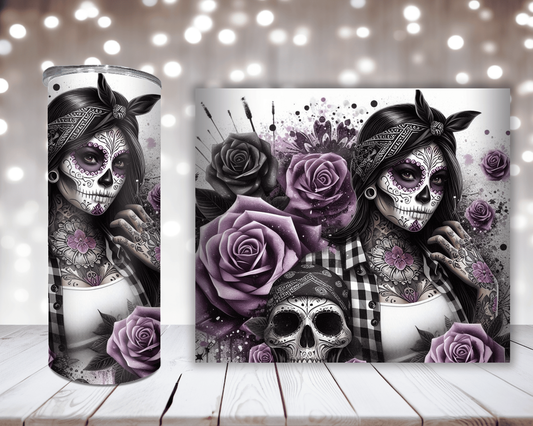 Der Thermobecher „Woman Skull und Rosen Lila“ kombiniert ein faszinierendes Skull Design mit eleganten, lila Rosen.