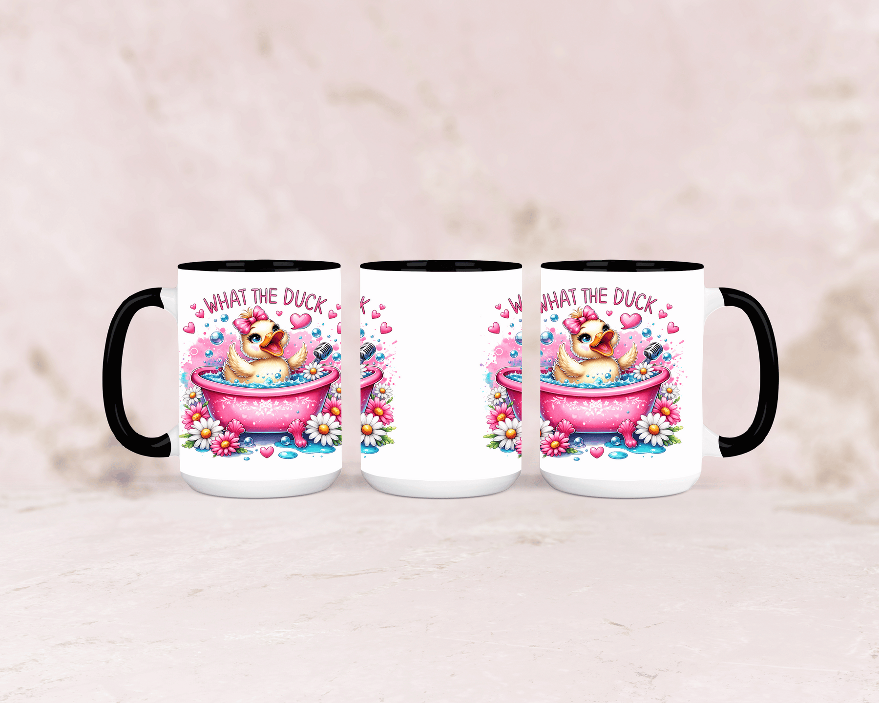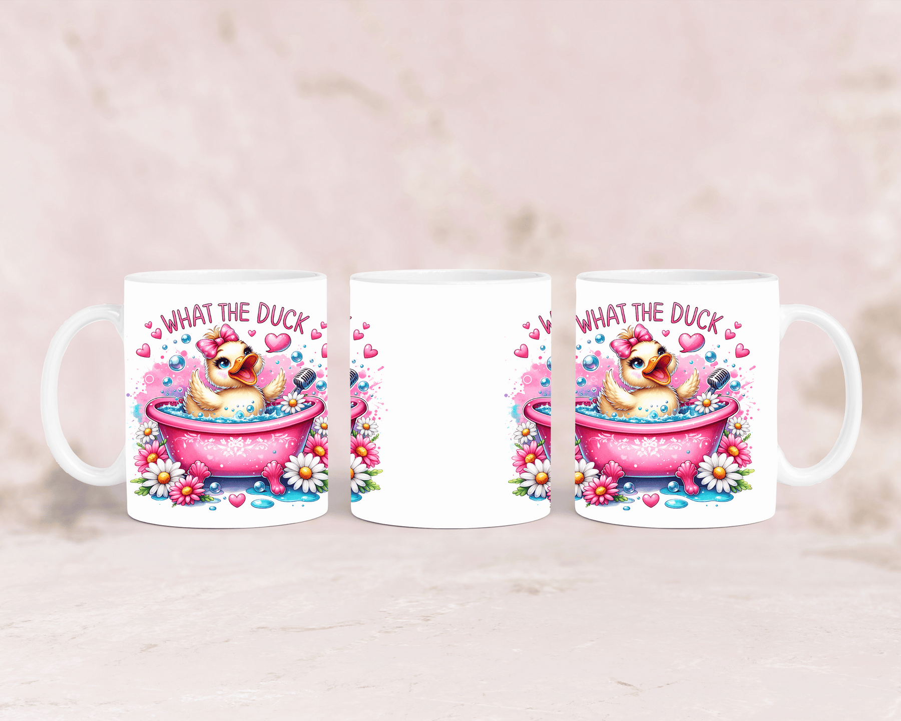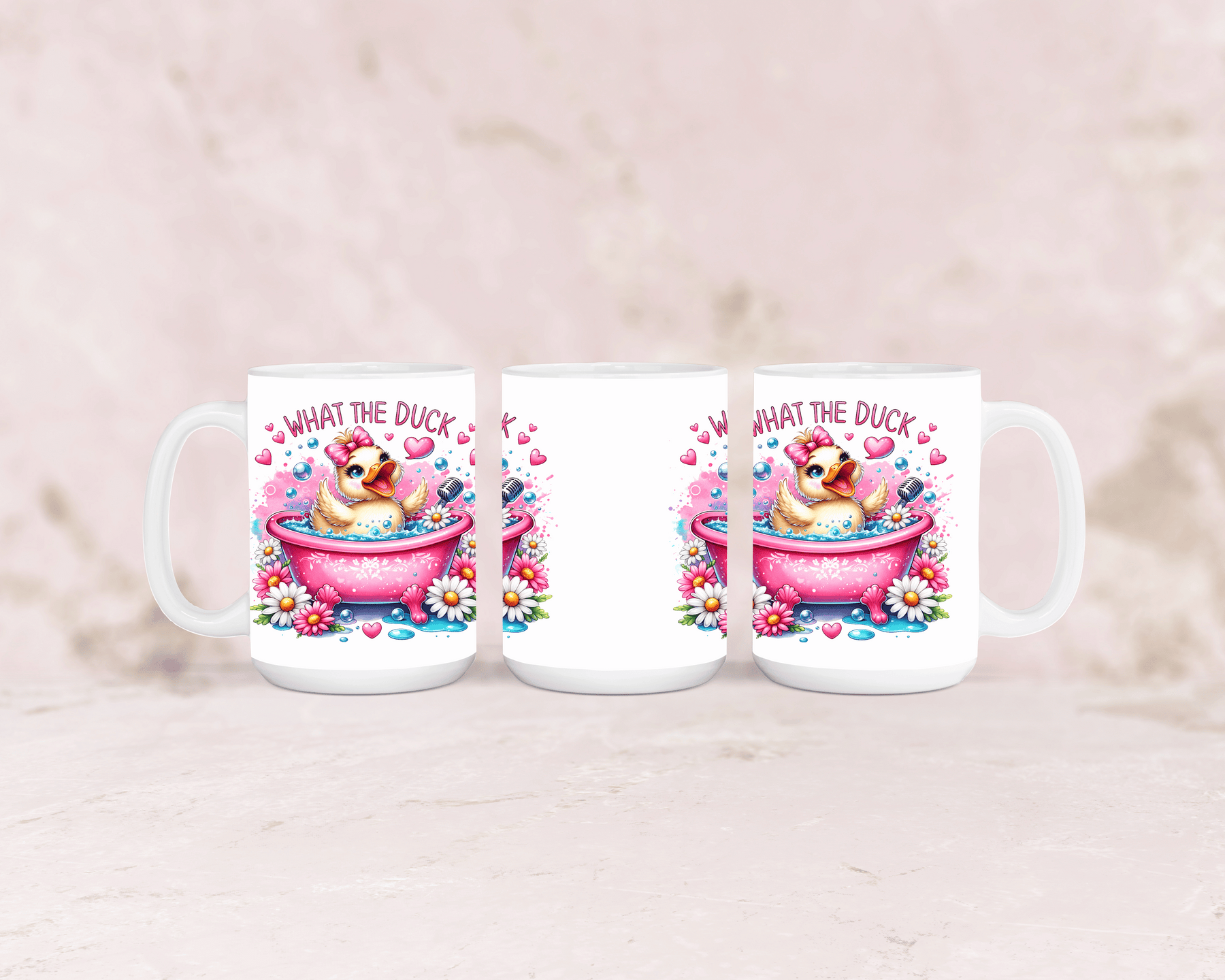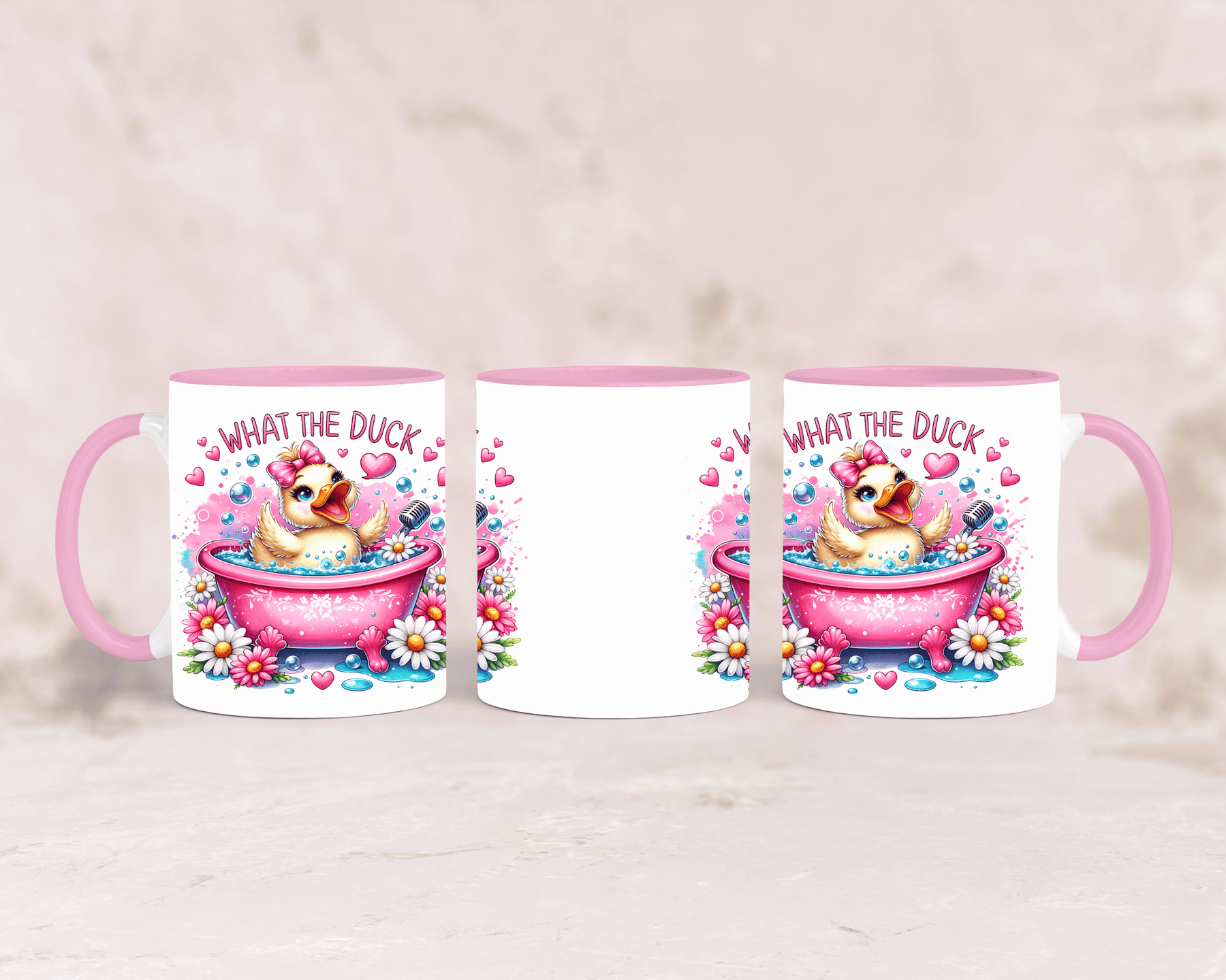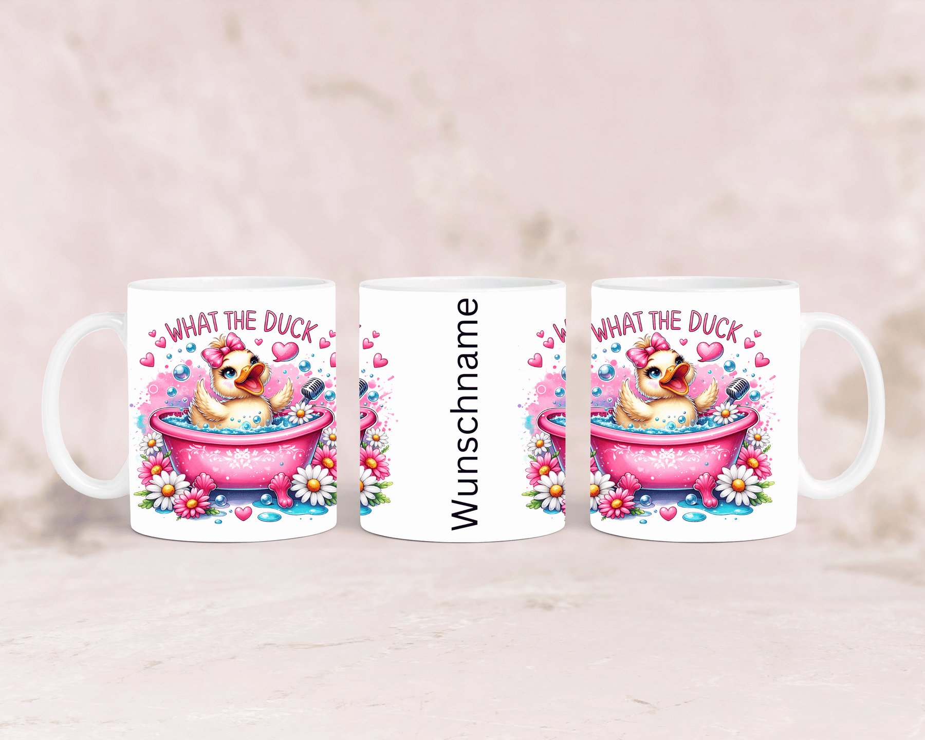 Tasse mit süßer rosa Ente und dem Spruch „What the Duck“ – personalisierbar