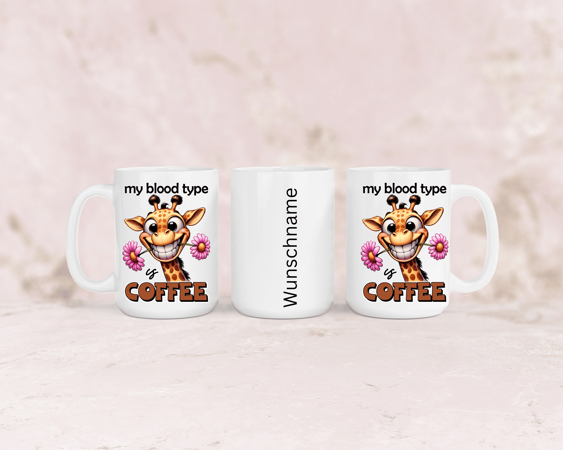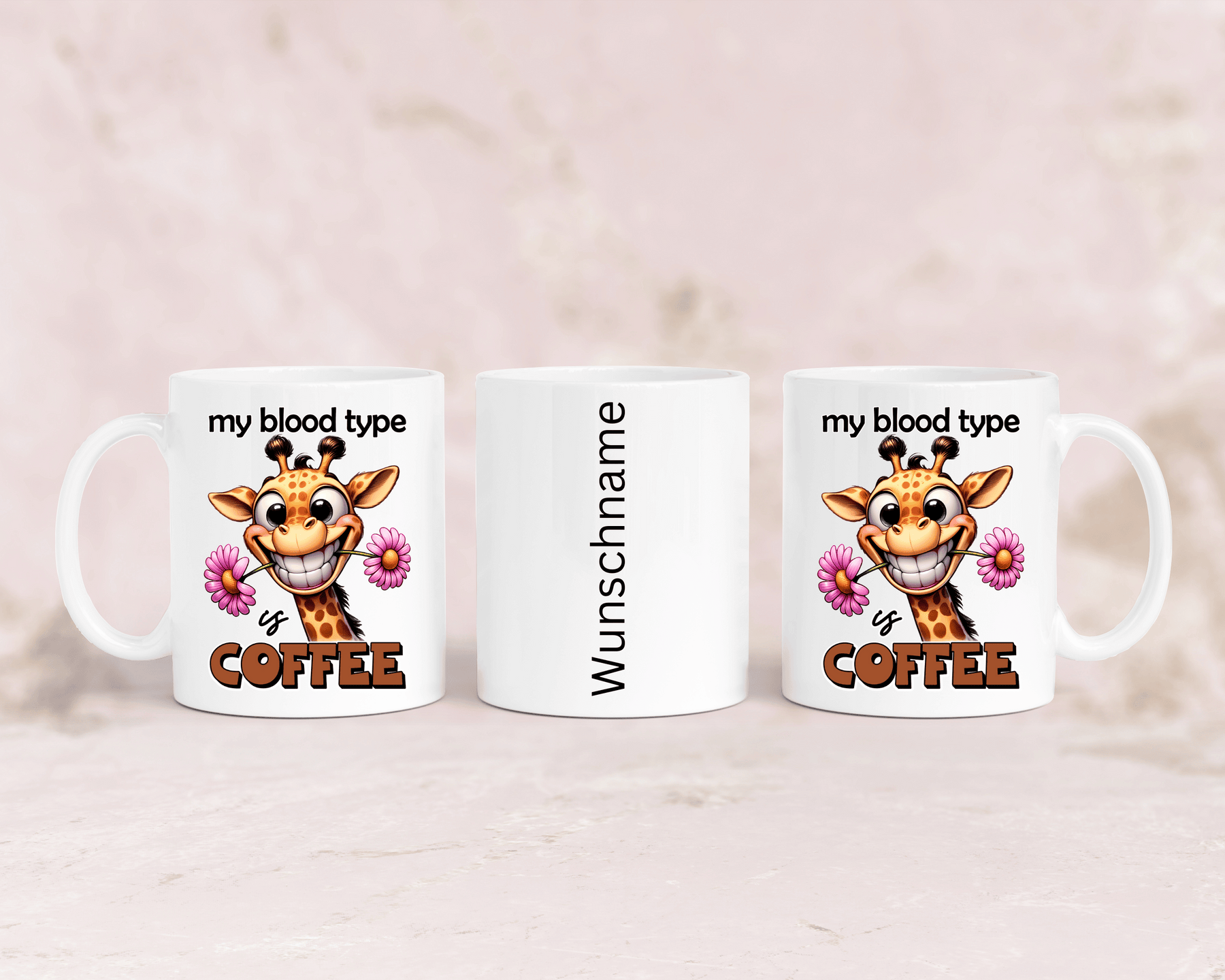 Tasse mit niedlicher Giraffe und dem Spruch My blood type is Coffee – personalisierbar