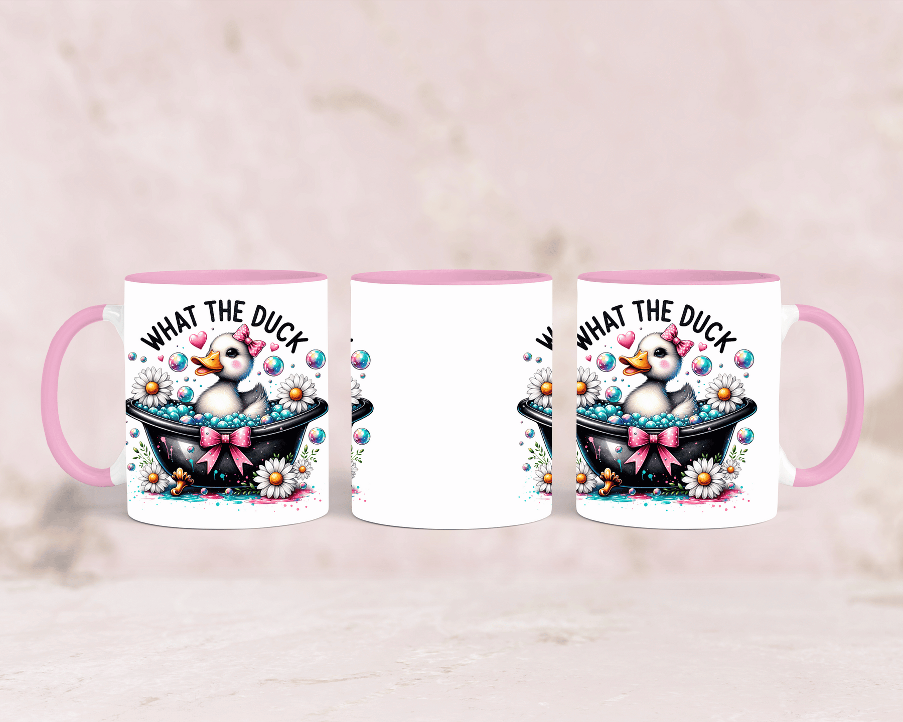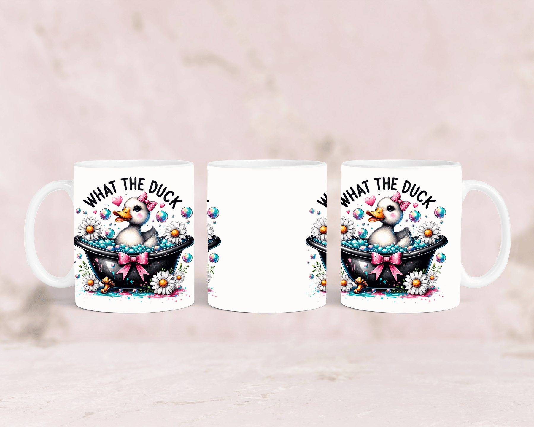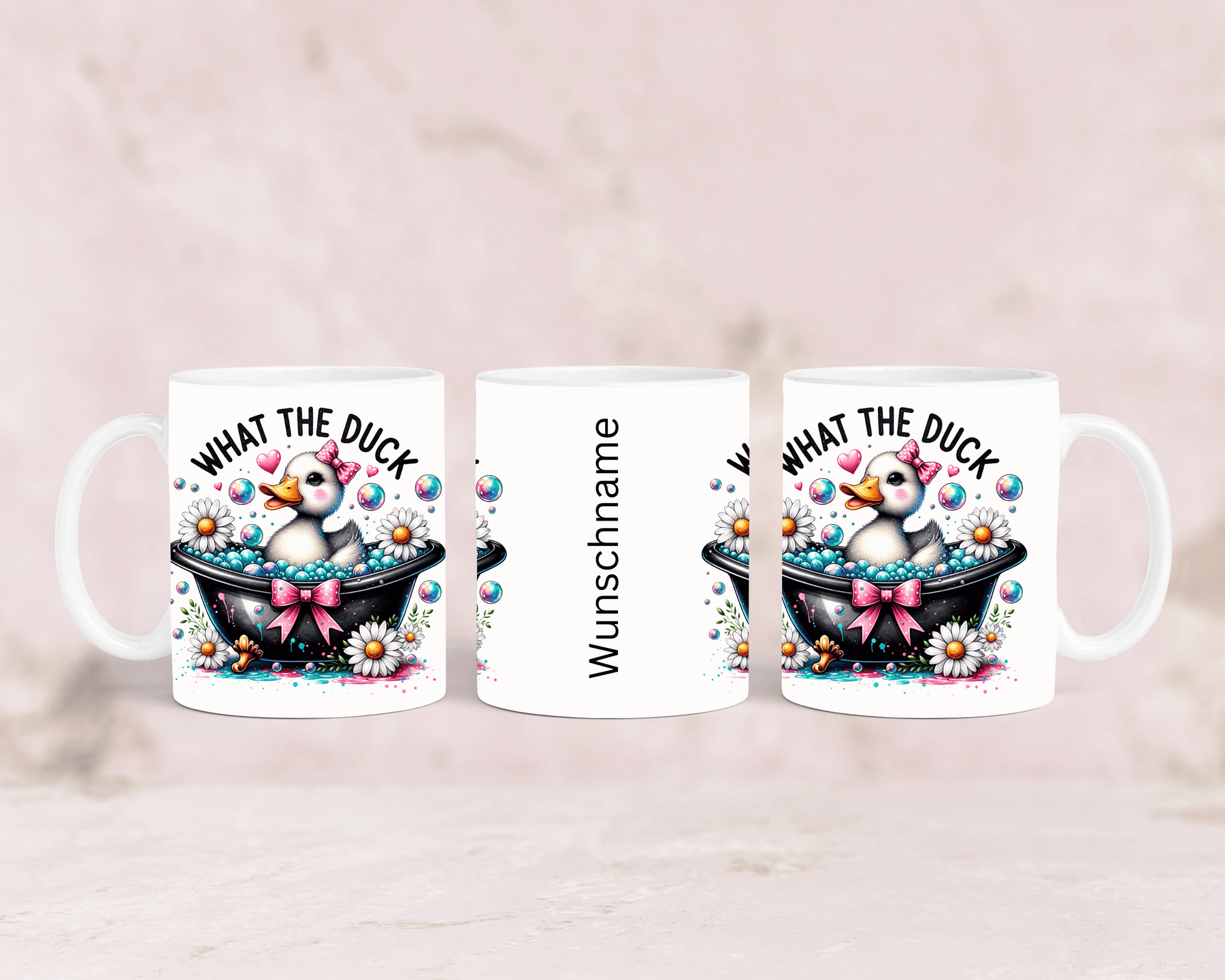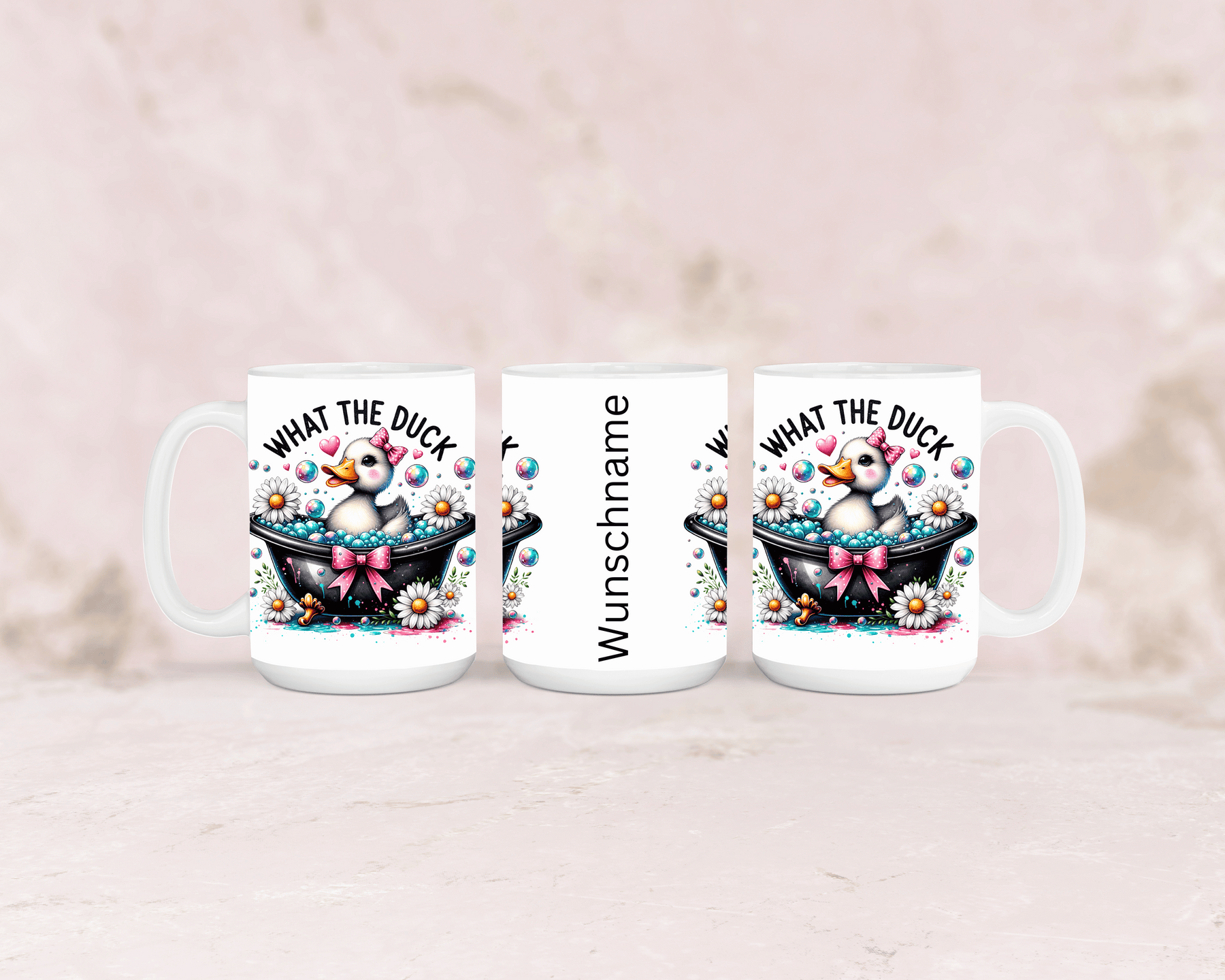 Tasse mit süßer Ente und dem Spruch „What the Duck 3“ – personalisierbar