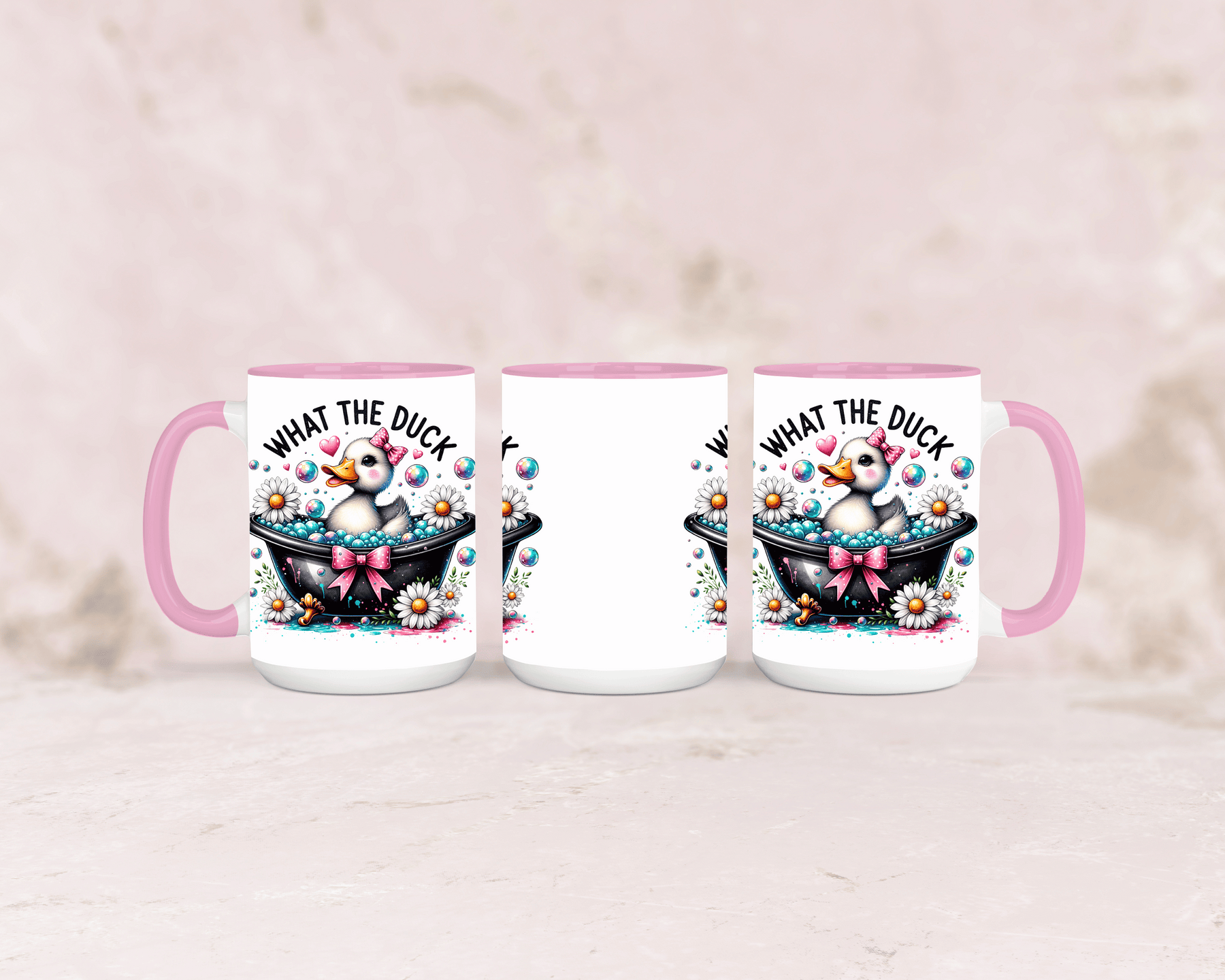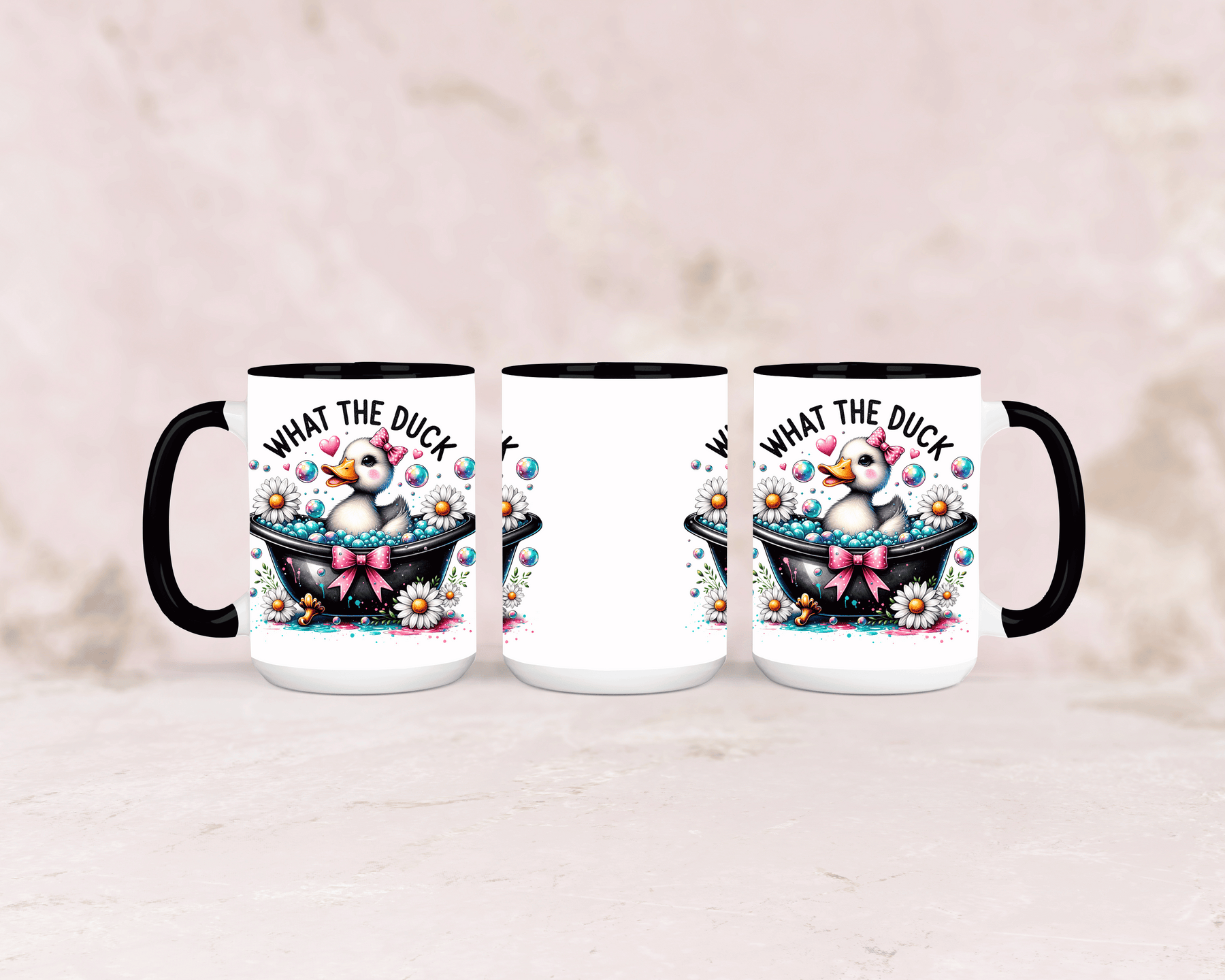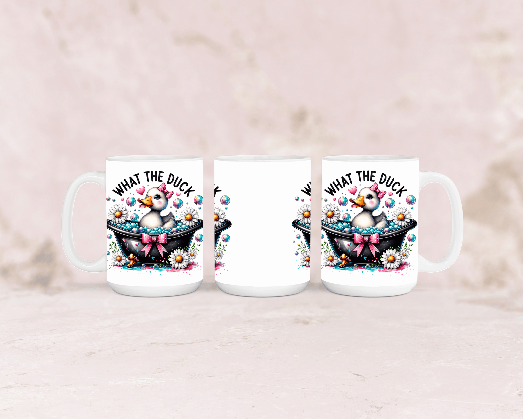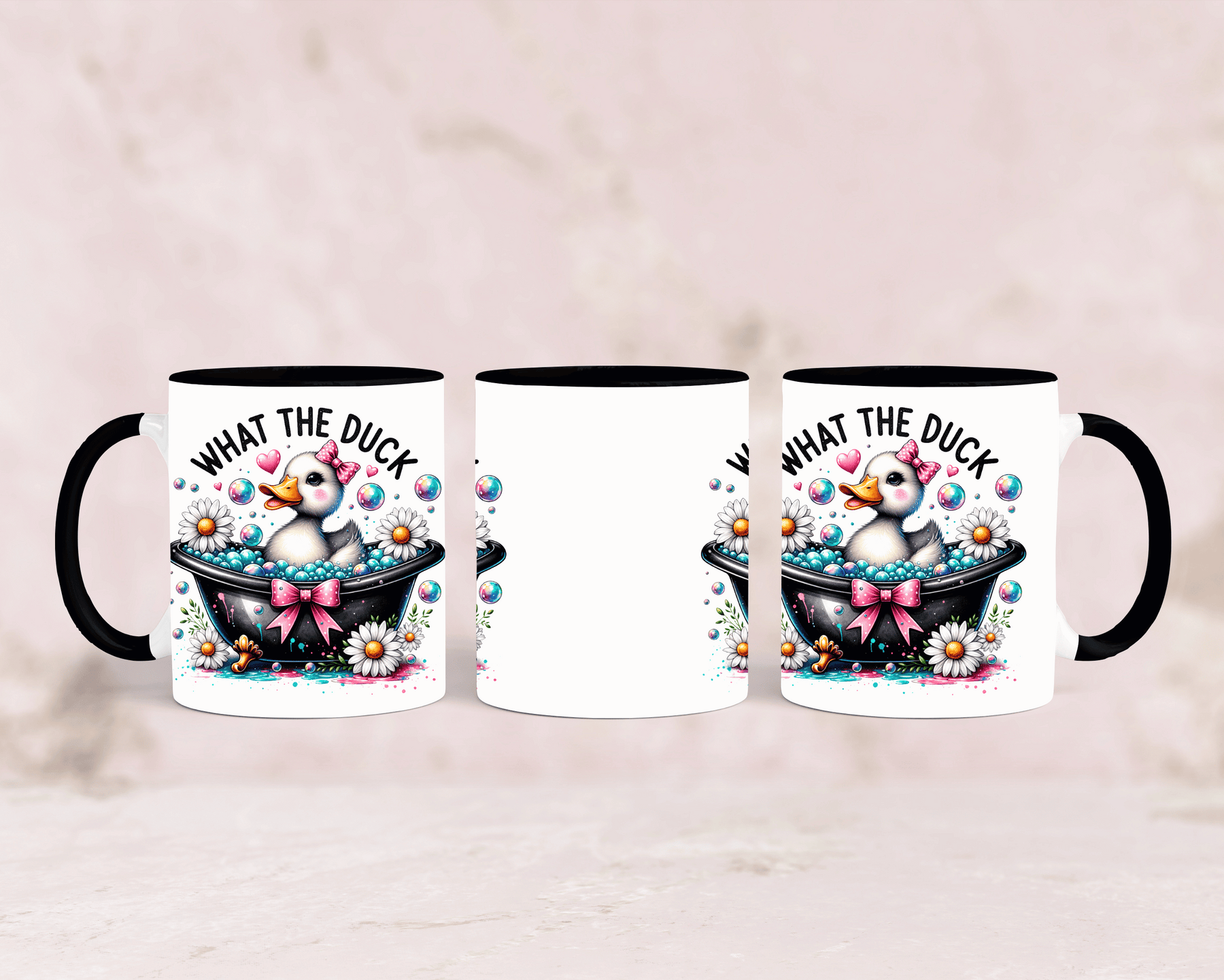 Tasse mit süßer Ente und dem Spruch „What the Duck 3“ – personalisierbar