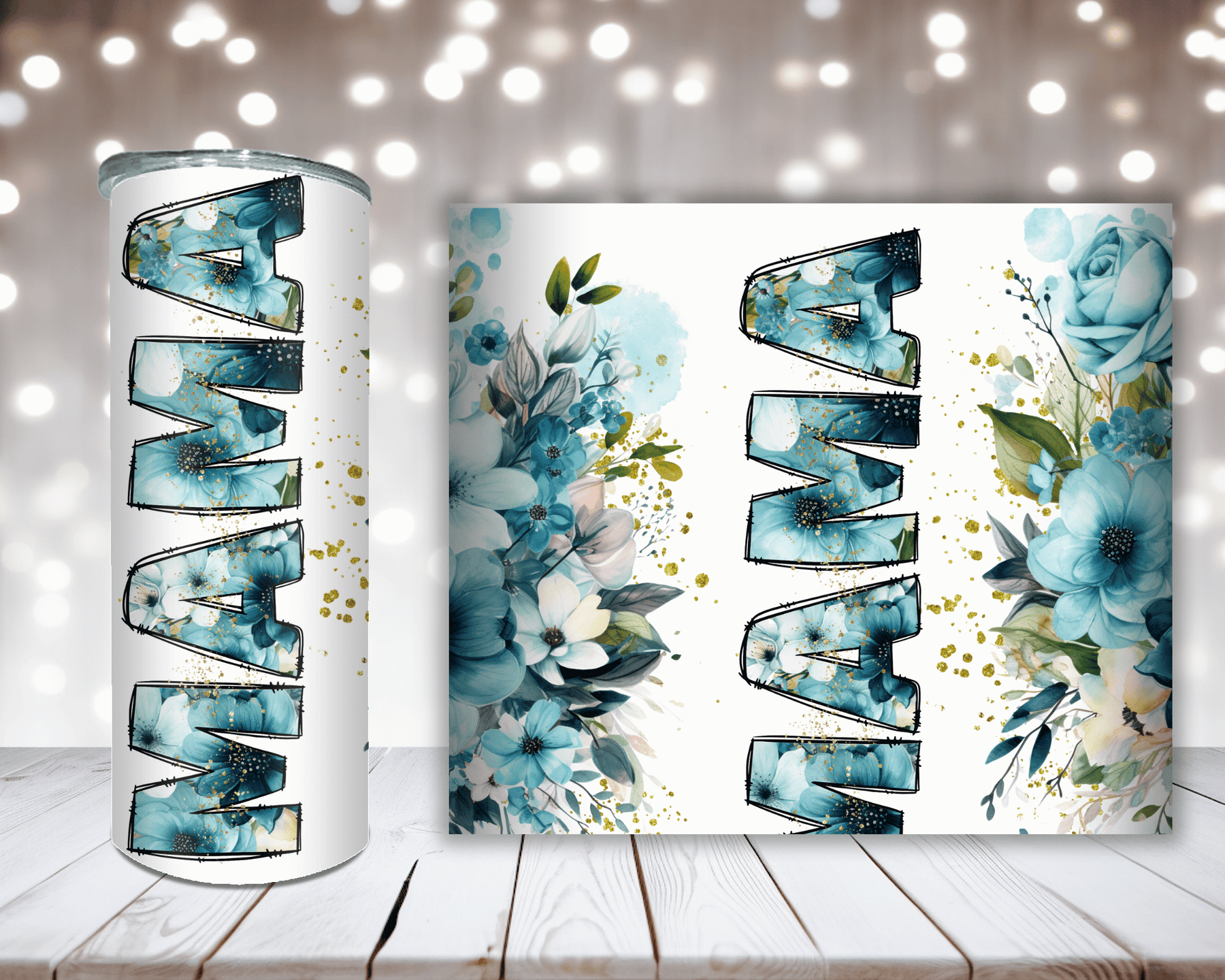 Der Thermobecher „Mama mit blauen Blumen“ ist ein stilvoller und praktischer Begleiter für jede Mutter.
